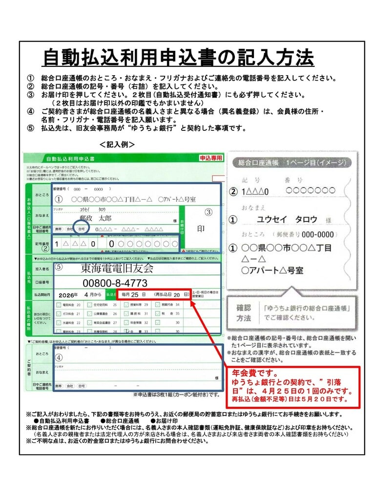 なお、会費の自動払込については、郵送費の削減、事務の効率化等、東海電電旧友会の活動にも大きく寄与するものです。