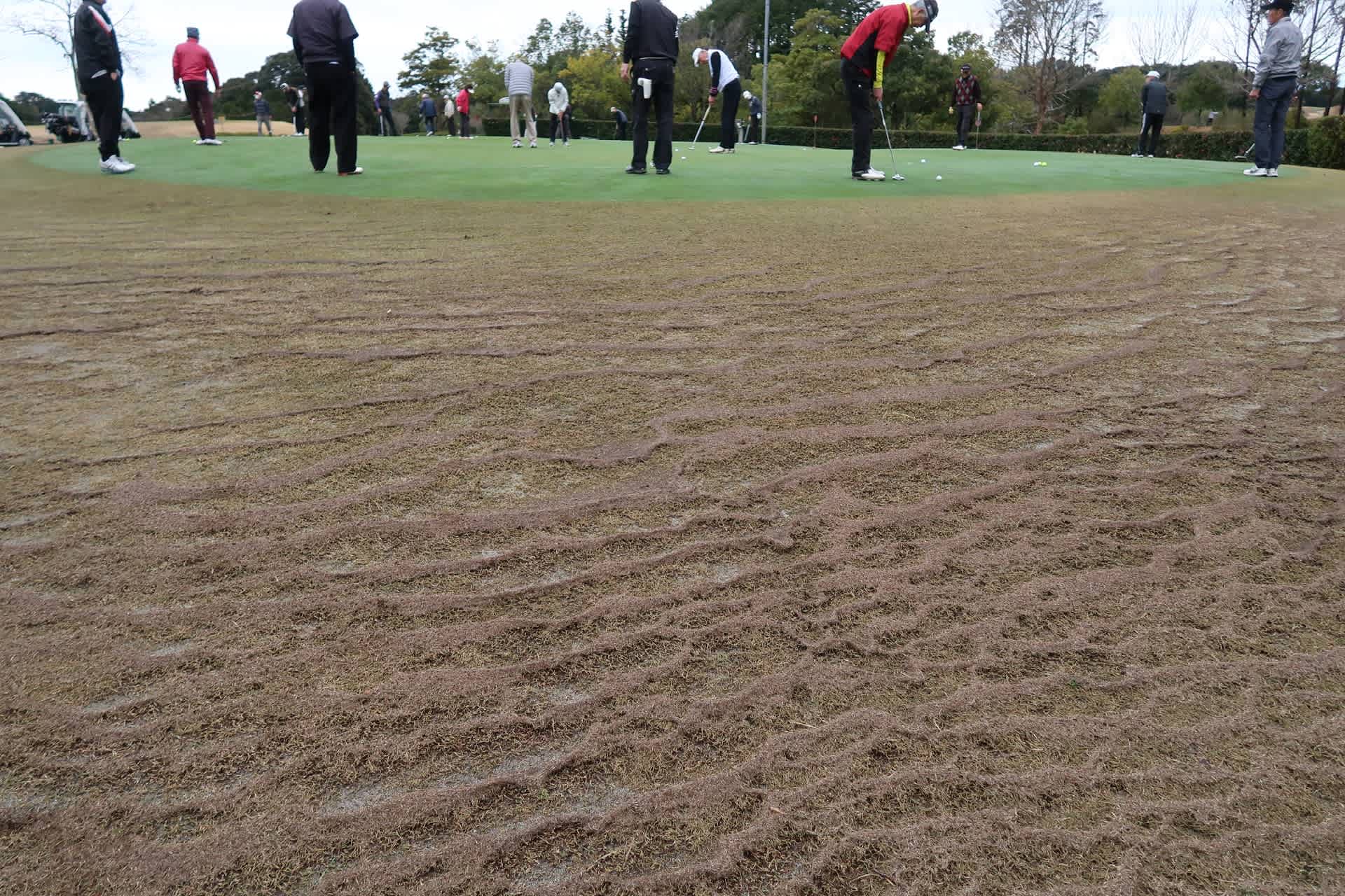 これが前日の多量の雨で流されて集まったというわけです。きれいな芝が売り物のゴルフ場でさえも、これだけのサッチが残っています。皆さまのご家庭の芝の状態に、ご不満のある方はサッチに原因があるかもしれません。芝が枯れている今のうちにサッチ除去をお勧めします。驚くほど大量のサッチが出てきますよ。