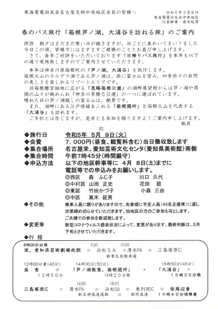 令和5年度バス旅行のご案内 名古屋支部 2023.03.252025.10.04 令和5年度バス旅行を実施します。 春のバス旅行「箱根芦ノ湖、大涌谷を訪ねる旅」 内容は下記の通りです。 記 ( 髙木延男 )