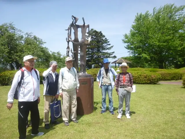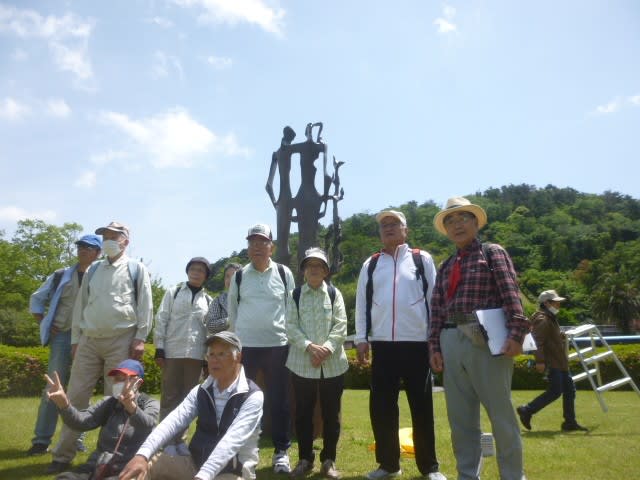 イベント広場にある伊東市の彫刻家「重岡賢治さん」のブロンズ像をバックに記念写真を撮り、小室山の山頂を目指して歩きました。