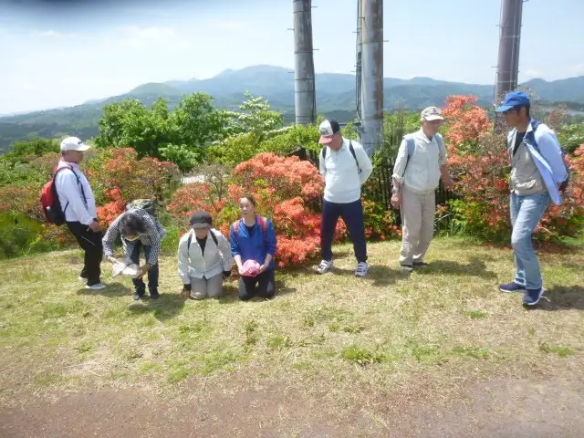 小室山に隣接する野球グランド近くを10時40分に集合で14名が参加しました。五月晴れの好天気に恵まれ、軽い準備体操をしてからつつじ園に向けて出発しました。