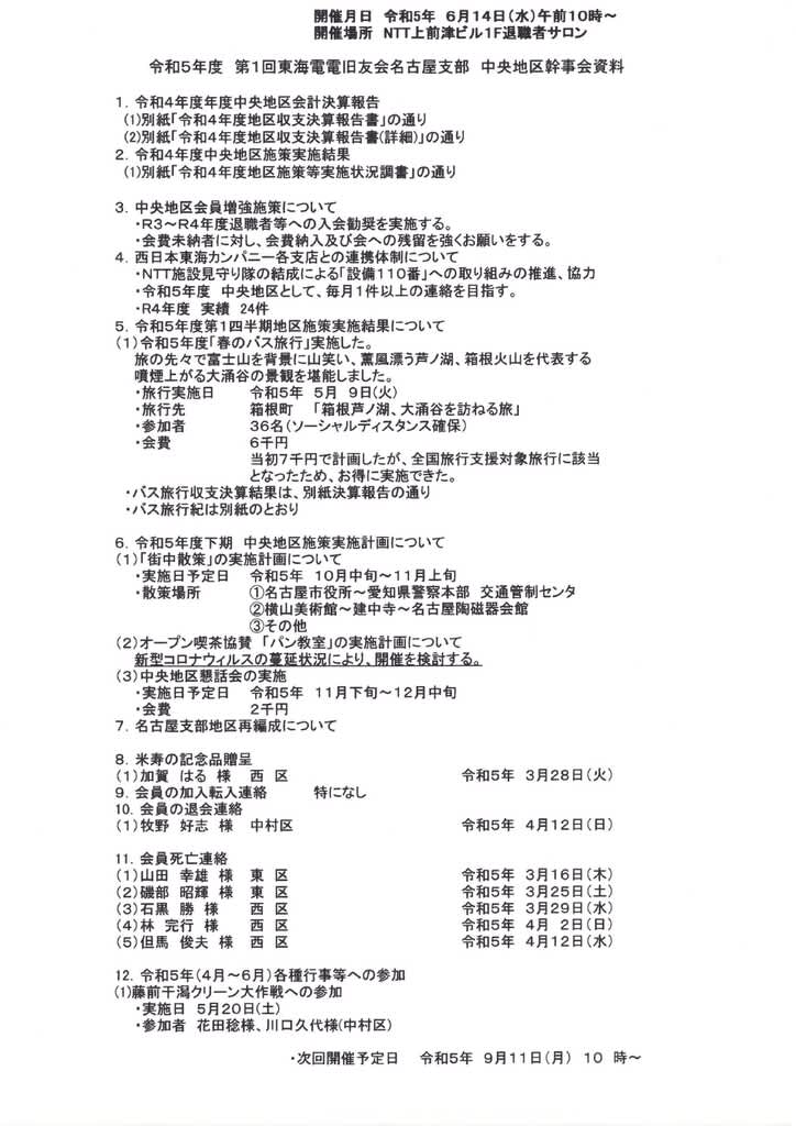 令和5年度第1回中央地区幹事会の開催 名古屋支部 2023.06.152025.10.02 令和5年度「第1回中央地区幹事会」を開催しました。 ・開催 日 令和5年6月14日(水) 午前10時から ・開催場所 NTT上前津ビル1F退職者サロン ・議題 等 「第一回中央地区幹事会資料」による 記 ( 髙木延男 )