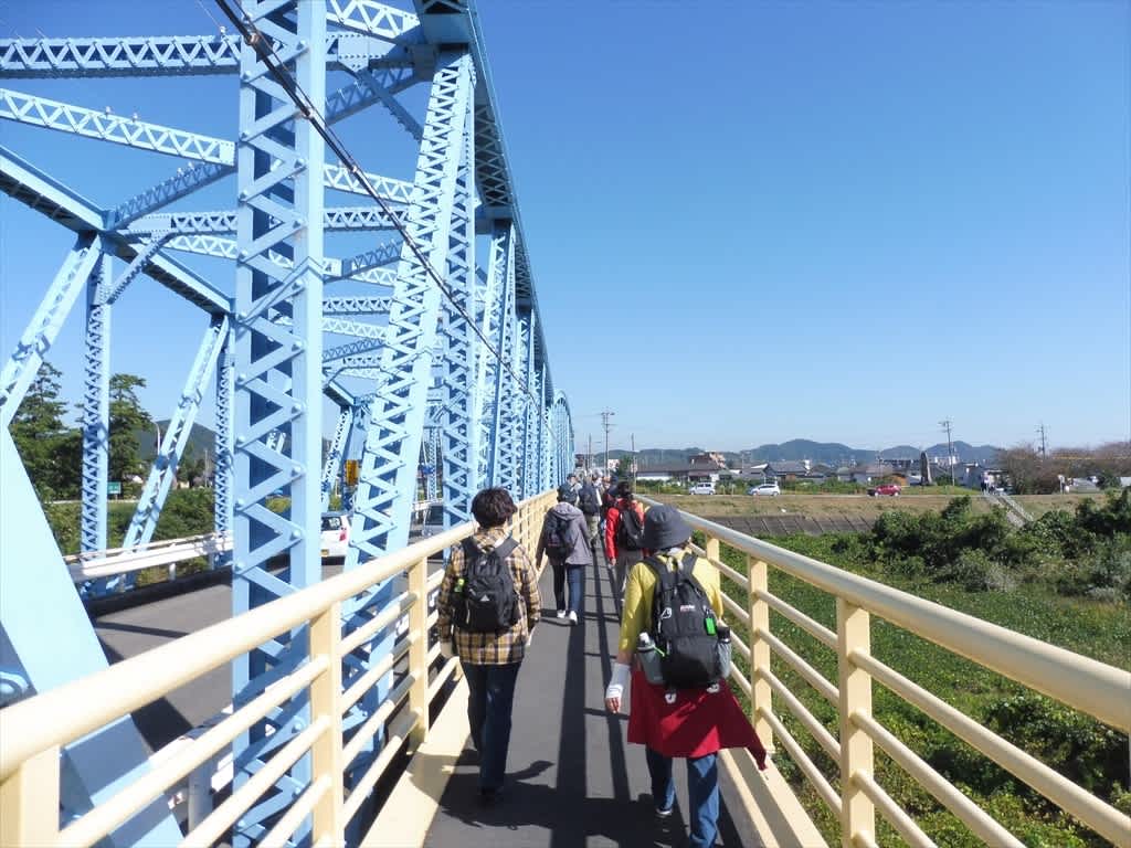最初に立ち寄った新金谷駅ではSLトーマス号を間近で見られ、ベストアングルを狙い、カメラに収める人もいました。金谷の町を抜け、江戸時代に渡船や架橋が禁じられ、「箱根八里は馬でも越すが、越すに越されぬ大井川」と詠われた大井川にかかる橋を島田へと渡りました。