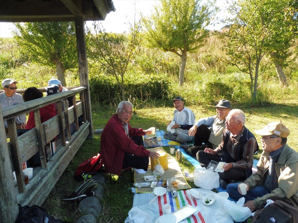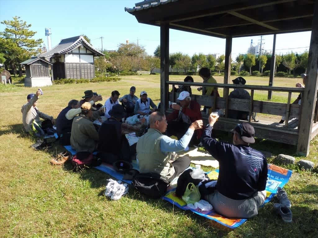 川沿いの島田博物館横の公園で昼食タイムでした。持参したお弁当を分け合ったり、中にはチョット一杯の人もありと楽しい宴となりました。昼食後、恒例の「ビンゴゲーム」では、話題のラグビーを反映させて、景品の受け渡しはノックオン(体の前に落としたらアウト)方式で盛り上がりました。