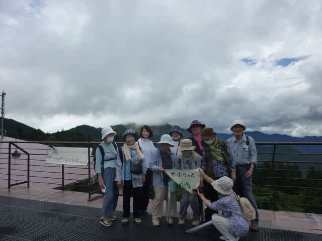 新穂高ロープウェー(標高2,150m)の西穂高口駅では雄大な笠ヶ岳などの大パノラマをバックに全員で集合写真。ガイドさんの合図で平湯にもどり昼食、身も心も弾み、ビールで乾杯。