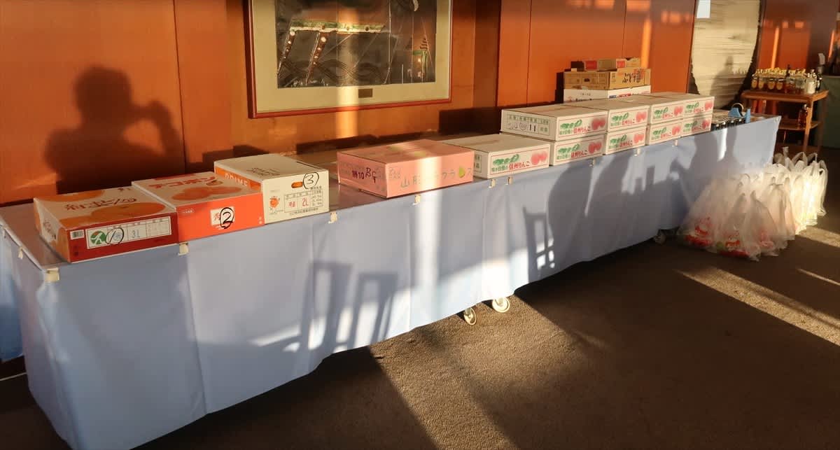 今回も。豪華な賞品。袋に入っているのは参加賞。中身はシャインマスカット&イチゴ。