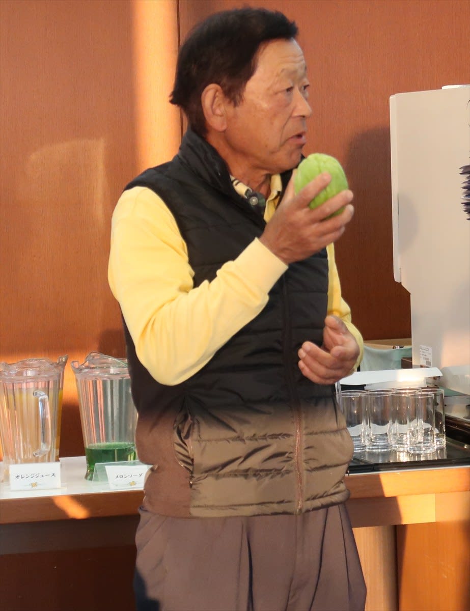 前支部長の太田さんが栽培し、参加者に配られたものです。はやとうりの紹介と調理法を説明中です。