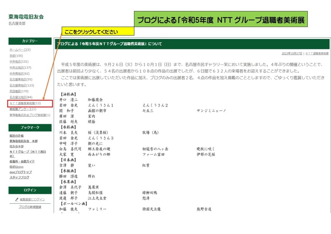 下記のように「カテゴリー」の「NTT退職者美術展」部分をクリックするだけですので、是非ご覧願います。