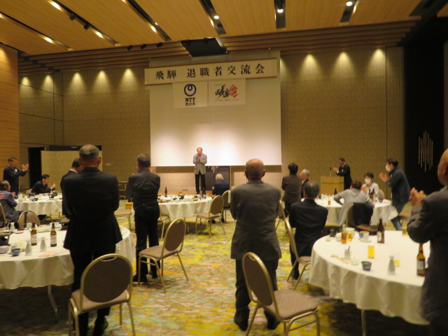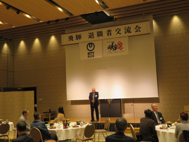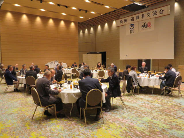 NTT退職者交流会が11月5日、高山グリーンホテルで開催され、退職者21名が参加。立木岐阜支店長から日頃の業務運営への協力に対するお礼やNTT西日本の近況についてお話があり、昨年に引き続くひさしぶり開催ということもあり、懐かしい話や近況に花が咲き大いに盛り上がりました。 (大下 久夫 記)