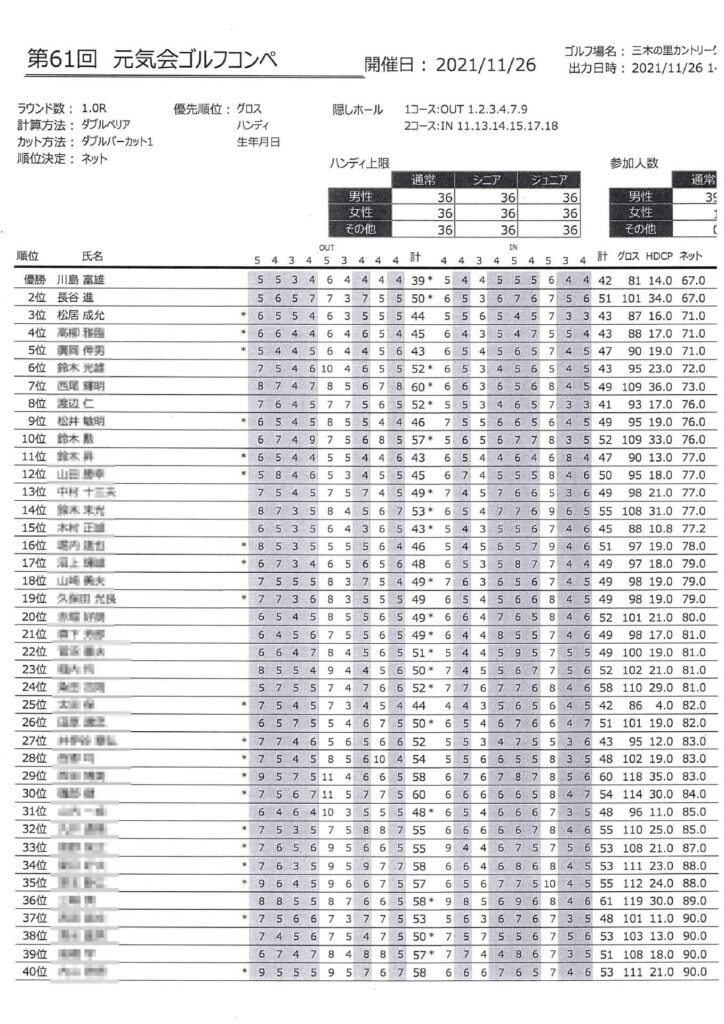 成績です ピンポジが難しかったためか、パターに苦戦し、皆さんスコアは今一つでした