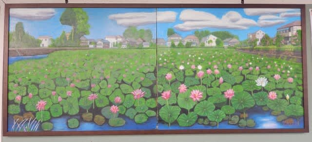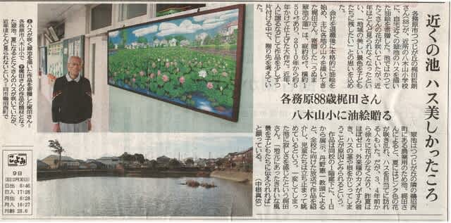 各務原市在住、岐阜地区旧友会員の梶田哲朗さん(88才)は、近所の八木山小学校に、自宅近くの翠池のハスを描いた油絵(縦65㎝、横150㎝の大作、約5年かけて仕上げたとのこと)を寄贈されました。翠池は鵜沼西町にある農業用ため池、夏になるとピンク色のハスの花が咲き乱れていたが、近年はほとんど見られなくなった。一変してしまった池に寂しさを感じるとともに「地元にあったきれいな風景を子供たちに伝えられれば」と願っているとのことです。なお、この取り組みは新聞記事にも取り上げられ報道されました。 ![]()