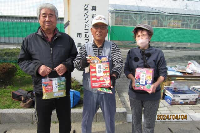 前日の雨降りも朝方にはすっかり晴れて、気持ちのいいグラウンド日和となりました。グラウンド状態は雨上がりの為に、しっかり固まり高速なグラウンド状況となりました。大会前に一番長い50メートルのホール練習では、「以前は全然届かなかったが、今日はホールポストをオーバーしてしまう」と、ビックリする会員さんが沢山見えました。大会が始まると固いグラウンドに四苦八苦してプレイしていました。8人のホールインワン達成者がいましたが、全体的には低調な成績でした。今回は前年度の会計報告と全成績表(大会7回)を配布しました。優勝者は横山氏(37打・ホールインワン2回)2位尾崎悦子さん(42打・ホールインワン1回)3位尾崎孝氏(42打)でした。尚グループ賞はグループ3位の方が受賞されました。写真は左から尾崎氏・横山氏・尾崎悦子さんです。今回も会員様から缶コーヒーの差し入れが有り、参加賞(洗剤)と共に沢山の景品を持ち帰りました。次回は来年5月に本巣みどり公園にて開催します。興味のある方は(090-2570-1270)まで連絡をお願いします。