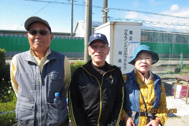天候に恵まれて、少し風が吹いている状態でしたが、気持ちのいいグラウンド日和となりました。公園内には可愛い幼児園児(50名位)達が食事中でした。私たちの大会を観戦してくれるのかと期待していましたが、早々に幼稚園バスにて帰りました。今回も少し目を離したところ、カラスに景品(虫よけコナーズ・トイレットペーパー等)を外側の包みを破られてしまいました。食料品でなくて良かったと思いました。大会のグラウンド状態は雨上がりの為に、しっかり固まり高速なグラウンド状況となりました。大会が始まると8人のホールインワン達成者がいましたが、全体的には低調な成績でした。優勝者は川上氏(38打・ホールインワン2回)2位村瀬純子さん(38打・ホールインワン1回)3位宮内氏(39打)でした。尚グループ賞はグループ3位の方が受賞されました。写真は左から宮内氏・川上氏・村瀬純子さんです。次回は6月に本巣みどり公園にて開催します。興味のある方は(090-2570-1270)まで連絡をお願いします。(村瀬 秀志 記)