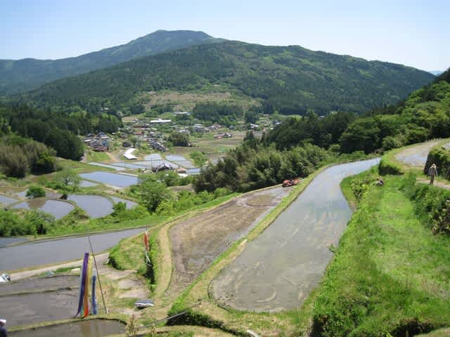 写真は、参加者皆さん、坂折棚田田植え準備風景 (丹羽 啓 記)