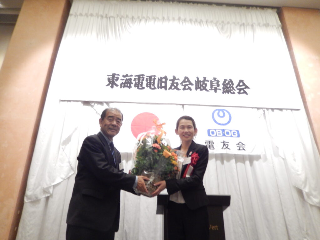 乾杯の後は、あっちこっちで懐かしい顔との歓談の輪ができて、アッという間に所定の時間が過ぎてしまいました。なお、歓談の途中、6月14日予定で執行役員東海支店長へご栄転される児玉美奈子岐阜支店長に、長年にわたる旧友会活動へのご理解とご支援に対する感謝の気持を込めて、佐藤支部長から花束の贈呈がありました。(箕浦 正 記)