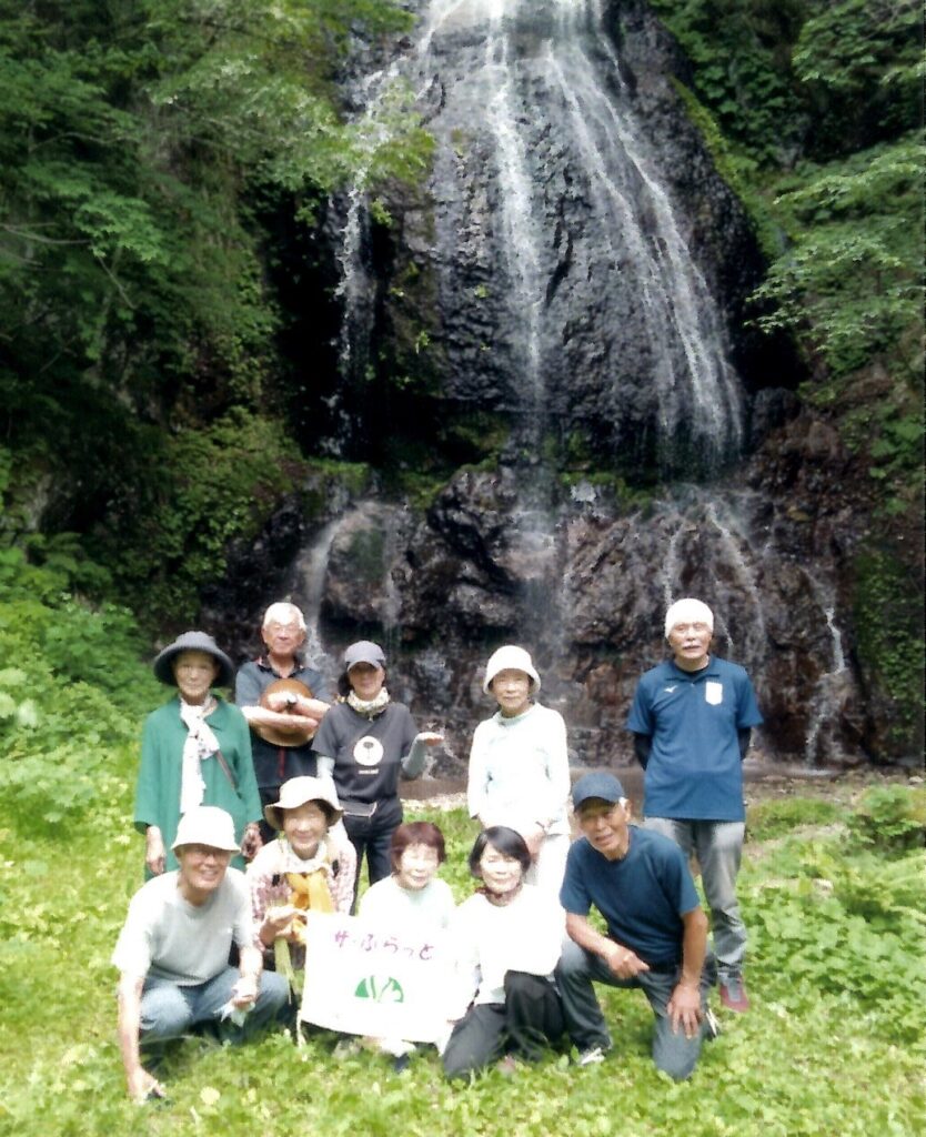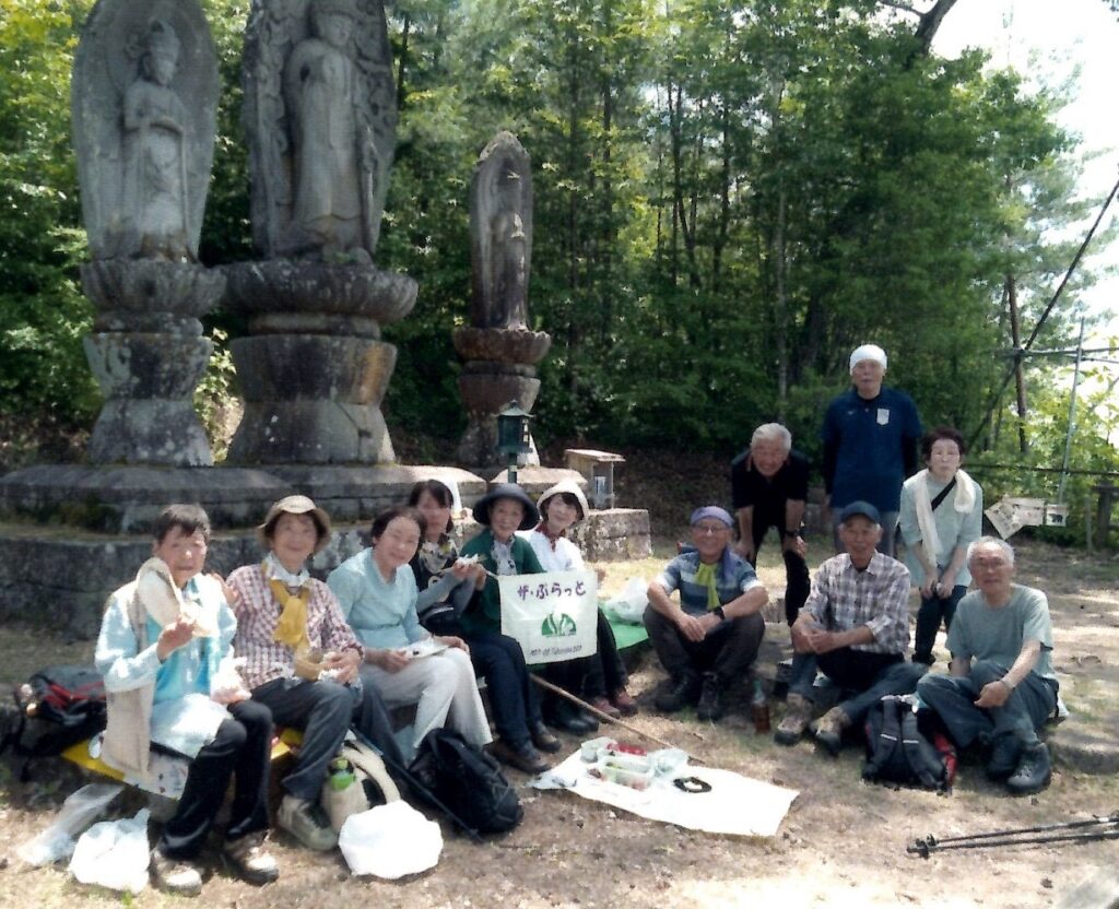 午前8時30分、高山市上二之町NTT第二ビル駐車場に集合、コロナ渦での延び延びを経てようやく歩こう会を実行しました。時代を超えた魅力に誘われ、めぐり逢おうと元気な12名。安国寺の裏山に広がる約19ヘクタールの緑の中、山の中央1,000段の石段、見上げると垂直のようでだが大丈夫と言いながら、準備されている杖を片手にさー出発。両國三十三か所めぐり石段に一歩踏み入れる。ゆっくり静かに登るとその途中、しばらくすると石仏が、ホッと心が癒され山頂に、誰ともなくご苦労さん、その声に全員晴れやかな表情となる。遠くには乗鞍、御嶽、白山連峰、最高のおもてなしに全員大満足、眼下には日本の原風景が広がり心がスーと心地よく馴染み一期一会、下りる時は気をつけてな、「はーい」お互い支え合う”ザ・ぶらっと”だから続けられる、終わりというものがないような気楽な会、あと三休の滝で心身ともにリフレッシュ、感動をあとにそれぞれ家路に。(五ケ山 絹子 記)