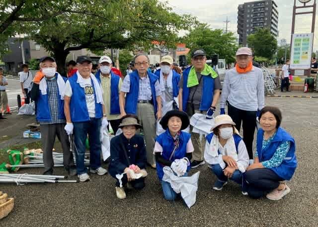 大垣市の夏の風物詩である「水都まつり」の開催を翌週に控えた7月27日に市内中心部を流れる水門川の清掃活動に参加しました。「水門川クリーン作戦」と題され、川を堰き止め、川底から清掃をする大規模な活動であり、市内の150を超える企業団体から700人以上の参加がある、毎年の恒例行事です。我が「NTTすいと会(会長:安田寛)」は12名の参加をしましたが、この日は開始直後に気温が30℃を超える猛暑となり、水分補給と日陰で休憩を取りながら川や八幡神社周辺のゴミ拾いを実施しました。汗びっしょりになりましたが、活動後は綺麗になった水門川を眺めて、水都まつりで行われる、川のほとりに万灯を並べてライトアップし、水の恵みに感謝する「水門川万灯流し」の幻想的な美しさに思いを巡らせ、解散、帰途に着きました(渡邉 昌司 記)