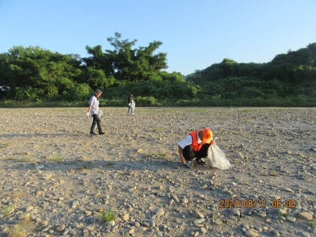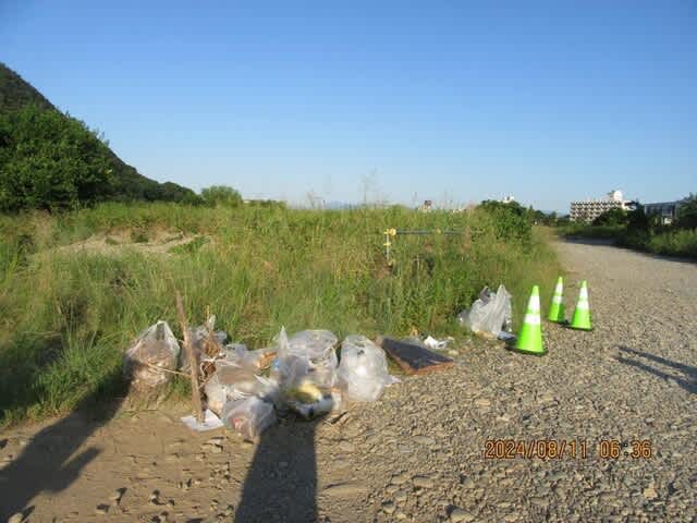 花火観覧が有料で開催されるようになった第2回ぎふ長良川花火大会後の清掃活動に、早朝6時から約1時間清掃活動に参加しました。花火見物客の河原への車両進入禁止やBQの禁止等、注意書きの立て看板が設置されていましたが、現実はBQの残り物が多く放置されており残念な気持ちでありました。花火の競演を思い浮かべながら、川原へ繫がる雑草をかき分けながら、大石、小石につまづきながら、各自手さげ袋いっぱいのごみを集めました。今回も大会実行委員会からはパン・お茶の配布がありました。(向井 繁之 記)
