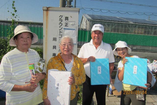 今回も暑い7月8月の開催を避けて、9月4日に実施しましたが、今年の猛暑は9月も続きそうで暑い日での大会になりました。グラウンド状態は至る所に雑草が生えたりして、満足のできる状態ではありませんでした。参加できない会員の理由は「暑いからとか・コロナの陽性になってしまった」等、本人の体調を考慮しての不参加でしたが20名の参加4組編成で開催しました。女性の方も手軽にできるスポーツとしてグラウンドゴルフだと思います。グランドコンディションが、やや不良のためかホールインワンが5名と少なく低調な大会でした。 入賞者は磯自慢セット・海苔セット・各組の3位にはお菓子・参加賞は洗剤・ホールインワン賞等を用意しました。優勝村瀬純子さん(40打・ホールインワン1回)第2位河出洋子さん(42打・ホールインワン1回)第3位尾崎孝氏(42打)でした。写真は左から河出さん・村瀬さん・尾崎氏・末武さん(BB賞)です。暑い中での大会、熱く燃えた女性が上位入賞の大半を占めました。次回は10月に本巣みどり公園にて開催します。興味のある方は(090-2570-1270)まで連絡をお願いします。(村瀬 秀志 記)