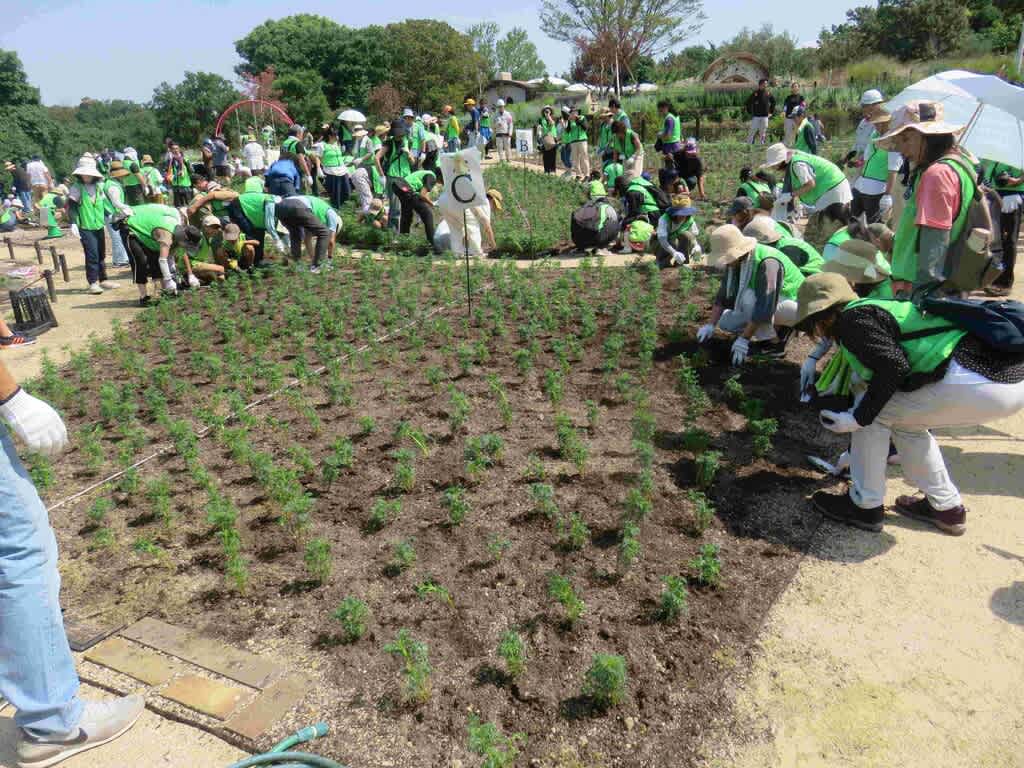 指導の下、それぞれ苗を約25cmの間隔で真ん中から周辺に向かって植え作業を