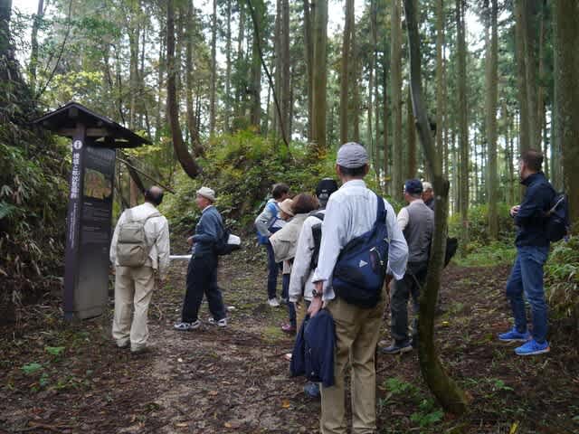 写真は、大正ロマン館前、土盛り砦の説明を聞く皆さん。