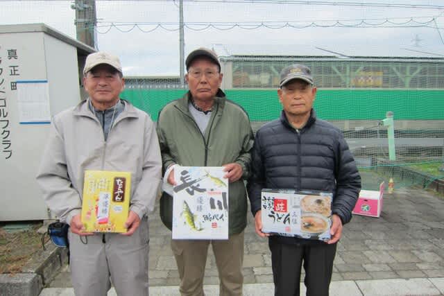 今年最後の第81回大会を、時々小雨の降る肌寒い中、参加者24名・5組5組編成にて開催しました。グラウンドコンディションは、前回生えていた雑草が無くなり最高の状態でプレイが出来ました。ホールインワンが15個(11名)も達成する好成績の大会になりました。地元で活動している会員の方は芝生・草むら・距離の短いグランド等ですが、当みどり公園は正規の距離を置く土のグラウンドですが夏場は雑草が生えている時があります。今回の優勝者は宮内環氏(34打・ホールインワン2回)2位村瀬秀志(35打・ホールインワン2回)3位河村武男氏(37打・ホールインワン1回)でした。今回の優勝者(宮内様)は今年度6人目の優勝者であり、まだ誰も2回優勝はありません。優勝者に贈られる栄えある逆ハンディキャップ(プラス2打)が有効に機能しています。写真は左から村瀬・宮内氏・河村氏です。次回は来年3月に本巣みどり公園にて開催します。興味のある方は(090-2570-1270)まで連絡をお願いします。(村瀬 秀志 記)