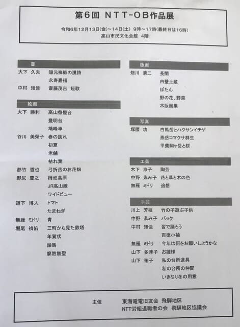 令和元年10月以来5年ぶり第6回目の飛騨地区NTT-OB作品展を次のとおり開催しました。東海電電旧友会飛騨地区とNTT労組退職者の会飛騨地区協議会との共同主催で開催、久しぶりの開催でもあり、出展を心待ちにしていたのか、素晴らしい、見事な作品が並びました。