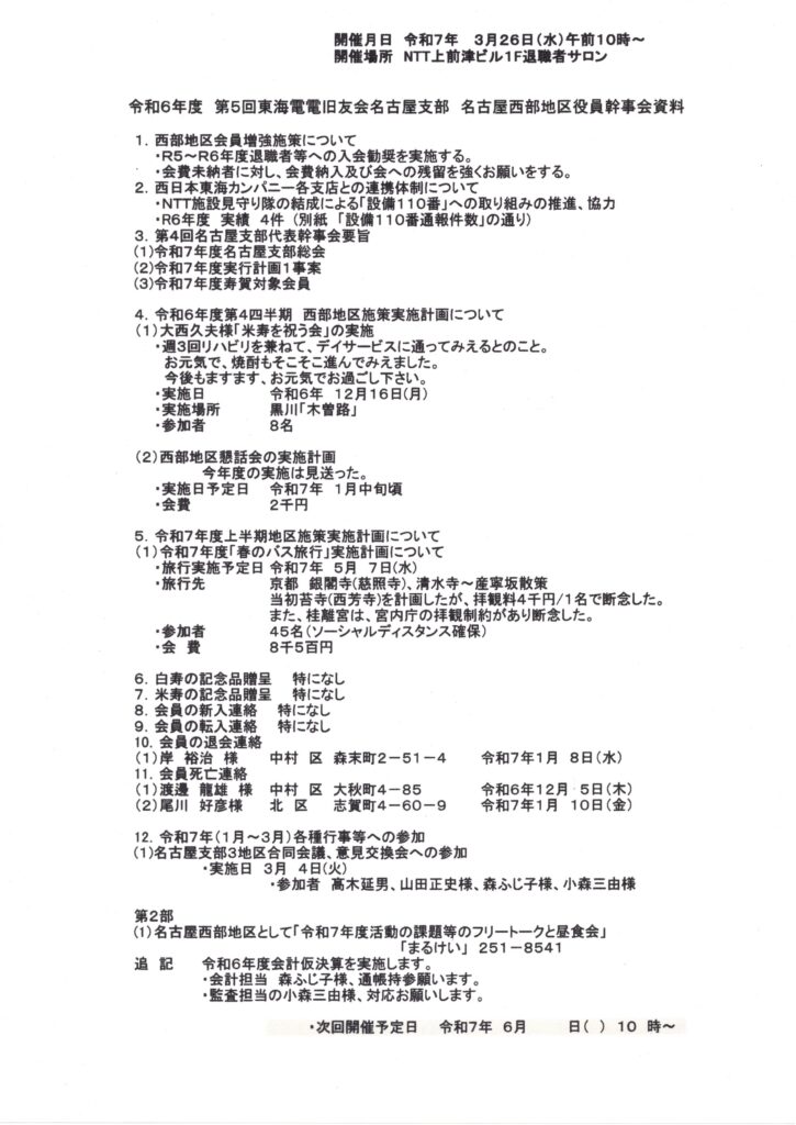 令和6年度第5回西部地区幹事会 名古屋支部OLYMPUS DIGITAL CAMERA 2025.03.192025.11.19 令和6年度第5回西部地区幹事会を開催しました。 ・日 時 令和7年3月26日(水)・開催場所 NTT上前津ビル1F退職者サロン・議事内容 第5回西部地区幹事会資料のとおり 記