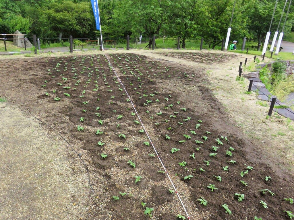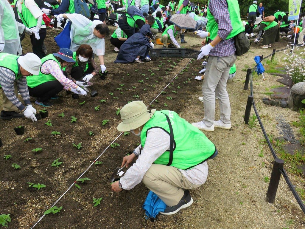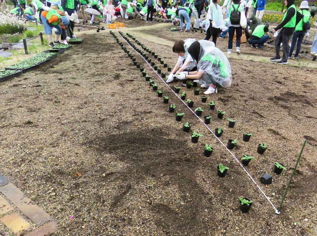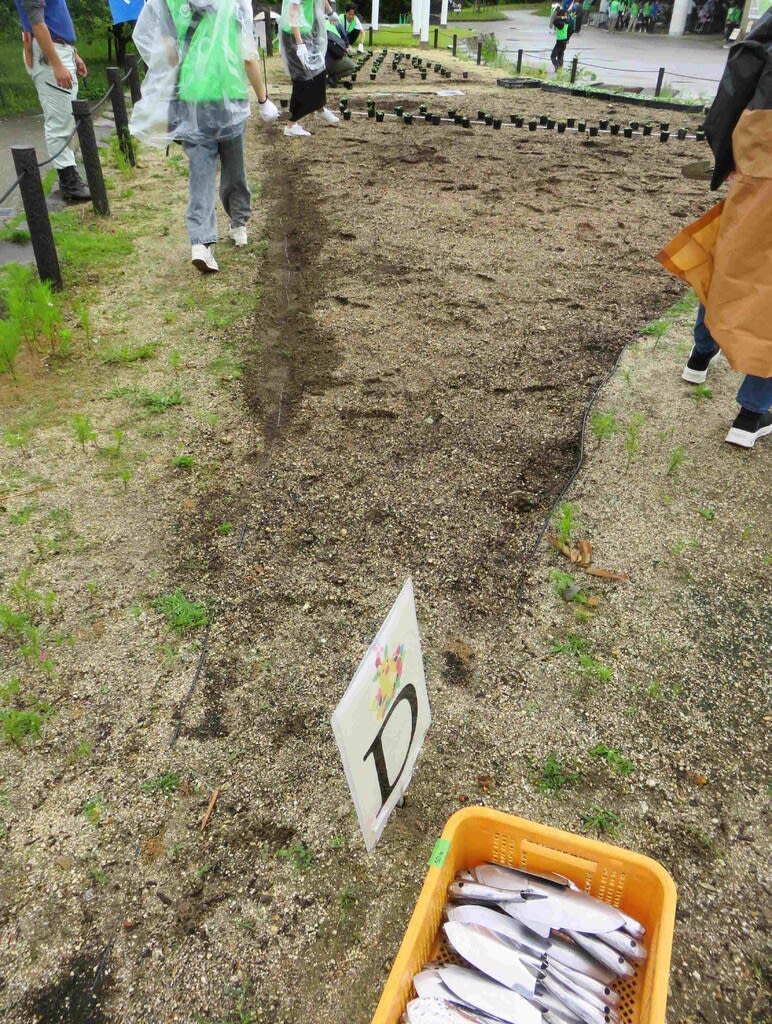 雨はほぼ止み、スケジュール通りに担当エリアに「ひまわり」の苗を植える。