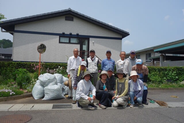今年度、最初となる「草刈り、剪定作業」は、特養ほほえみ福寿の家(稲口)に9時30分に集合し、男性8名、女性4名、合計12名の精鋭部隊で行いました。 当日は、梅雨入り前の晴天に恵まれましたが、暑さと戦いながらの作業となりました。玄関周りの生垣剪定、建物周辺の草刈り、切り取った枝葉の袋詰めと作業を分担し、約2時間で無事終了することができましたが、昨年より日差しが強く、全員汗びっしょりとなりながらの奮闘でした。