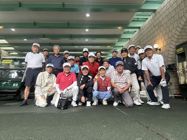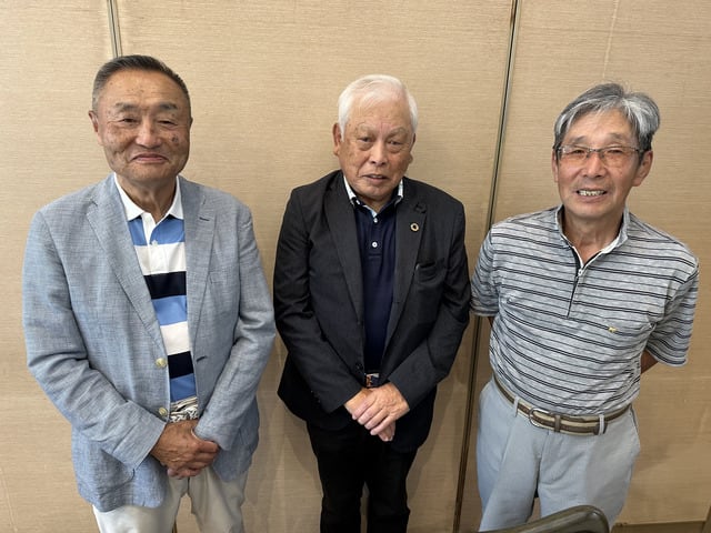 梅雨入り一週間後のコンペとなり天候が心配でした。当日、コンペ開会式前から強い雨が降り、集合写真も屋根付きのスペースでの撮影となりましたが、スタート時には雨が上がり、ナイスショットの連発で楽しくコンペスタートを切りました。今回から2名の若いメンバーが加わり賑やかに盛り上がりました。競技方法はダブルペリア方式で行い、久しぶりに参加の川島通宏さんが見事に優勝いたしました。コンペの成績は雨天のせいでパター練習ができなかったにもかかわらず平均グロス94.8とスコアは上々でした。上位入賞者は優勝:川島通宏さん(Net72.2)、準優勝:武田康郎さん (Net73.6)、第3位:宮脇 勺さん(Net73.8)でした。おめでとうございます。※次回は、令和7年9月に実施する予定です。 (写真)左から、準優勝の武田康郎様、優勝の川島通宏様、三位の宮脇 均様です。(松原 章 記)