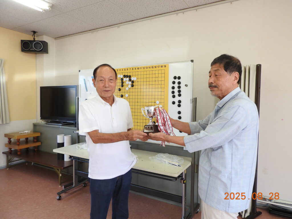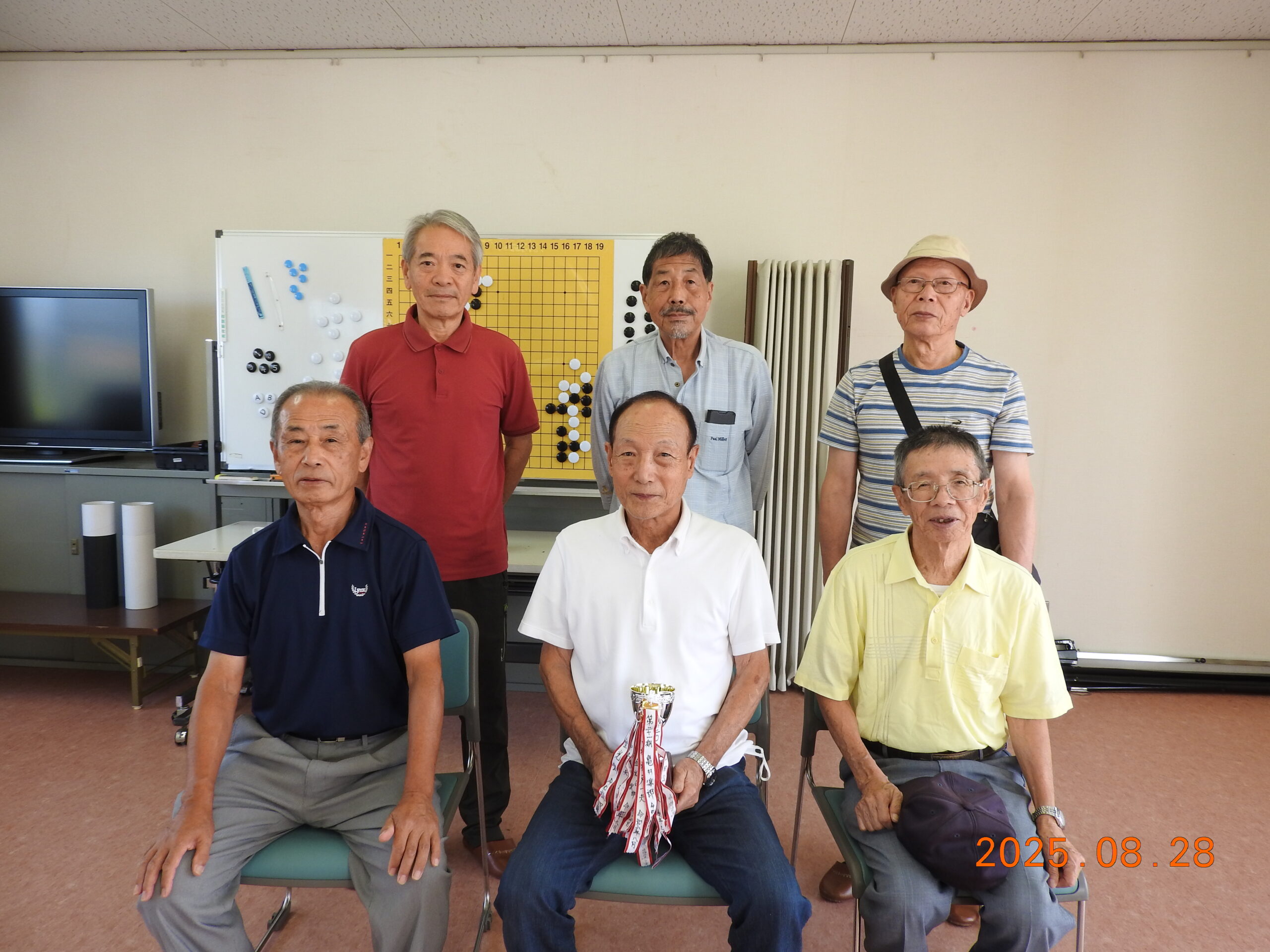 今年6月から8月末にかけて第21期本因坊戦を開催しました。総当たりによる対局を実施する中で、2期連続した勝率が「昇級」「降級」に影響するため、終盤になるとメンバーの情熱・意気込みが今まで以上に増していき、1手・1手真剣な面持ちで対局しました。また、本因坊戦を行う中でも毎月第1週と第4週はメンバー全員が交代で講師になり、「詰碁」や「手筋」などの囲碁研修にも取り組んでいます。第21期本因坊戦は、地道に熱心に囲碁に取り組み、着実に棋力をアップさせた亀井敦郎さんが、7勝0敗の好成績で優勝しました。併せてトロフィー授与と、記念撮影も行いました。会員のより一層の棋力アップや対局をすることで元気で楽しい時間を共有できるよう囲碁に取り組んでいます。