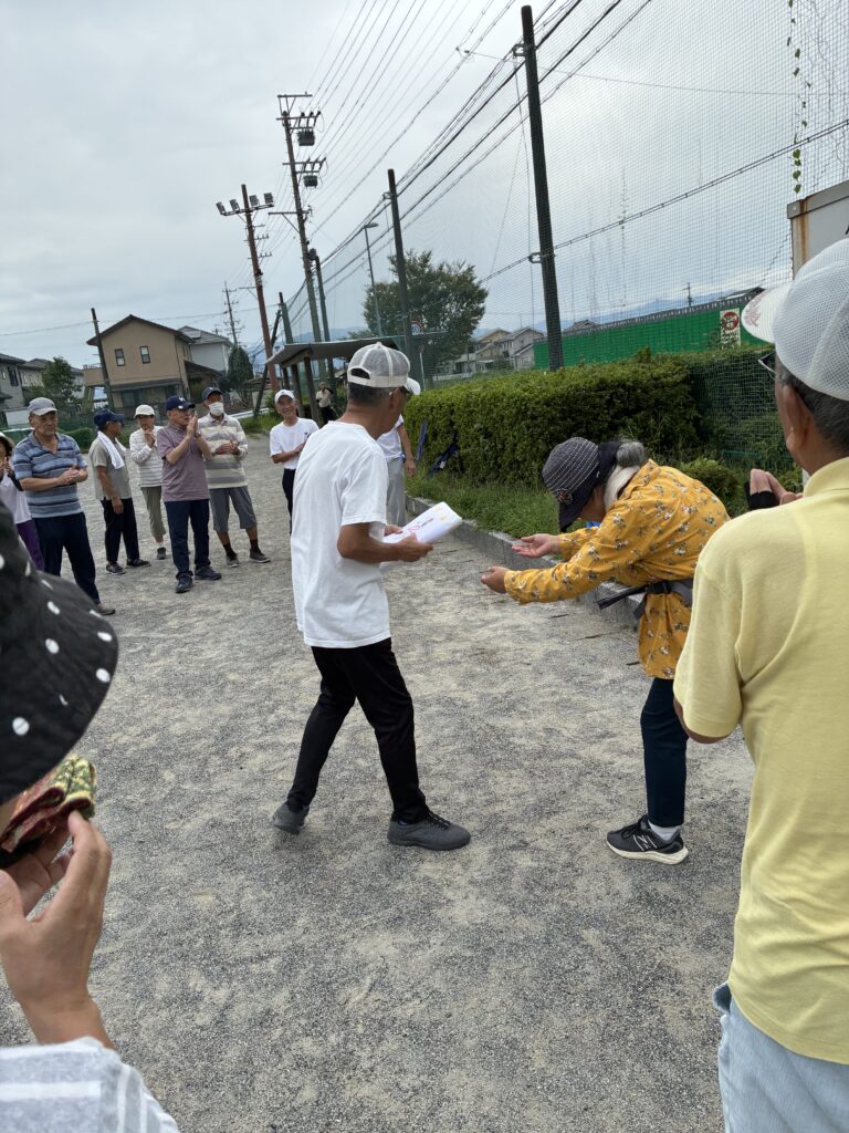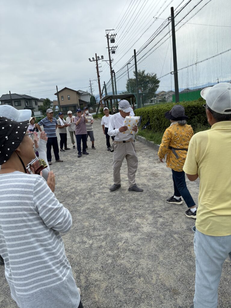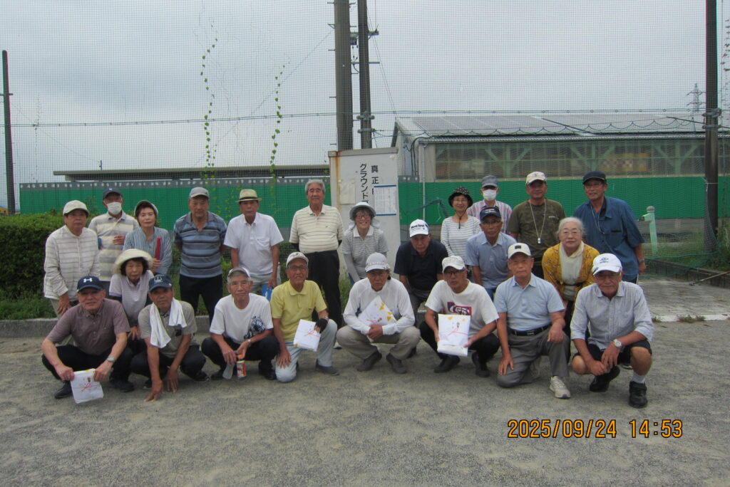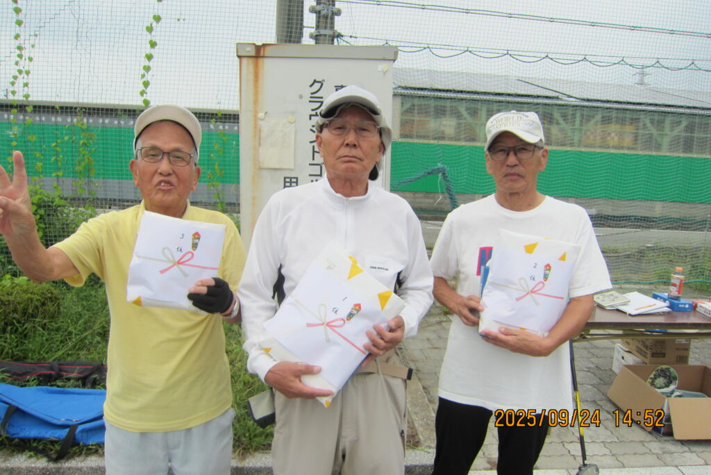 「暑さ寒さも彼岸まで」どおり、お彼岸を過ぎた今回の大会は、すっかり秋の気配を感じる最高のグラウンドゴルフ日和でした。暑い7月・8月を避けて2カ月ぶりの開催でしたが、記録的には少し低調でした。ホールインワンも全体で7個しか達成できませんでした。最近の物価上昇により大会の景品選びにも苦慮しています。今回の優勝者は宮内環氏(37打・ホールインワン1回)2位堀豊氏(40打・ホールインワン1回)3位横山輝彦氏(38打)でした。グループラッキー賞は、各組5位の方でした。写真は左から横山氏・宮内氏・堀氏です。尚、表彰式終了後に支部役員中川様から旧友会の新たなホームページ開設の紹介がありました。(会報誌ゆうゆうとうかい10月号でお知らせあり) 次回は10月22日に本巣みどり公園にて開催します、11月6日に県交流会が中池公園グラウンドで開催されます。興味のある方は(090-2570-1270)村瀬まで連絡をお願いします。 (村瀬 秀志 記) 楽しみだなあー(メンバー記)