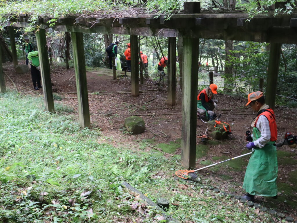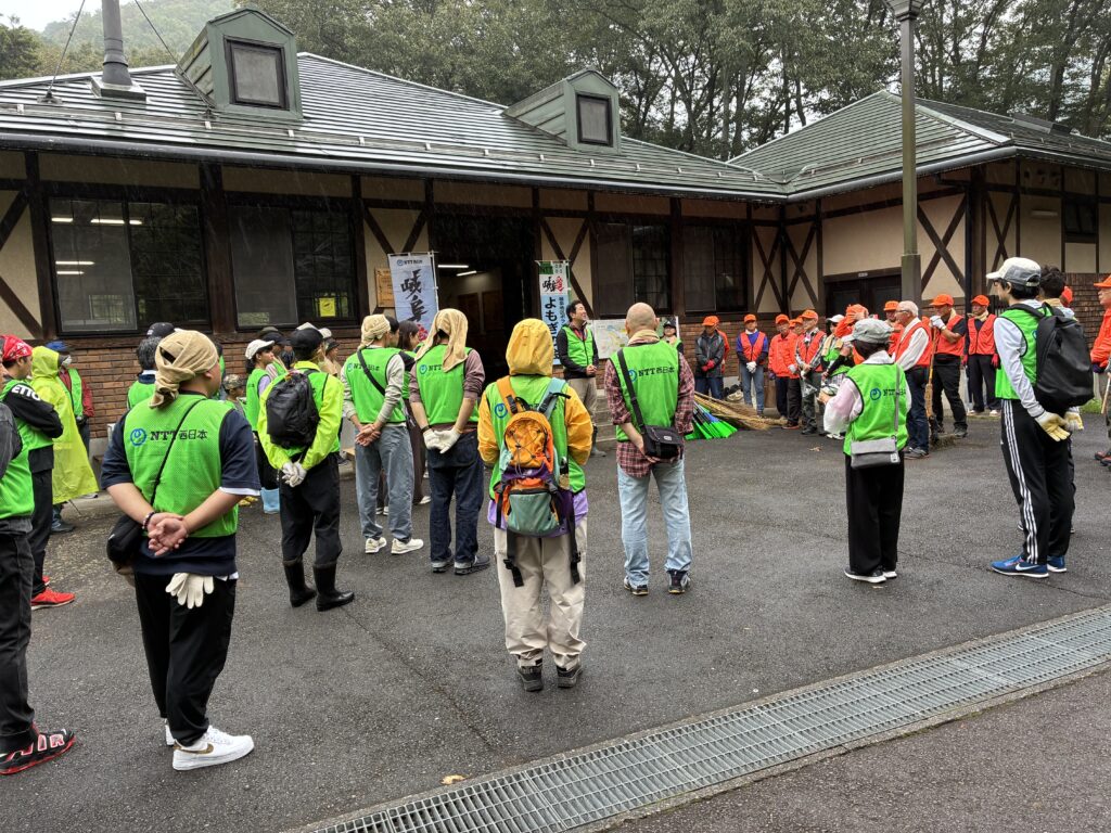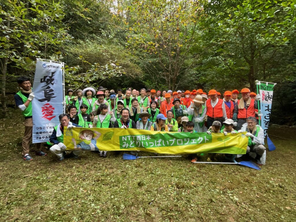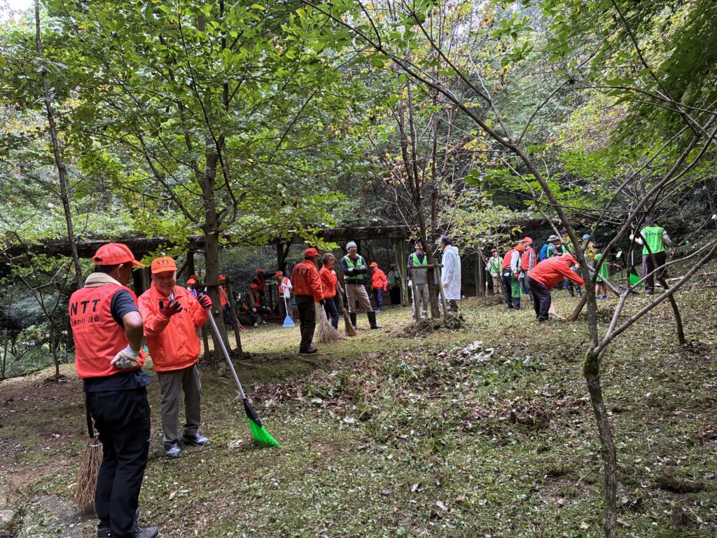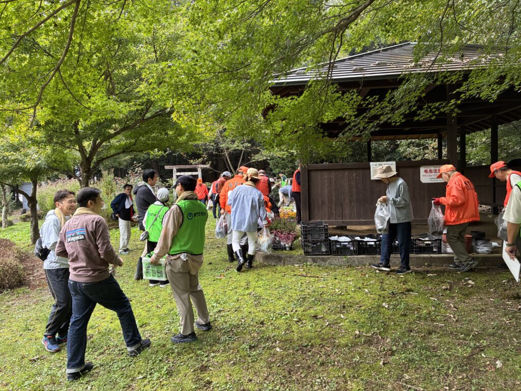 NTTグループ共通の社会貢献活動である「Green With Team NTT」の参加型の環境ボランティア活動として、ながら川ふれあいの森において、下草刈りによる里山の保全活動が実施され、NTT-OB・OGよもぎの会のメンバーも参加、一緒に汗を流しました。集合場所の駐車場へ行くと金木犀の甘い香りが迎えてくれました。雲息が怪しい中、四季の森センター前でのオリエンテーションで、立木岐阜支店長からの激励の挨拶と隊長からの作業手順などの説明を受け作業に取り掛かりました。草刈機4台と竹箒・熊手・高足鋏などを活用して、植樹した苗木周辺や遊歩道等の下草刈り、落葉・枯れ枝の除去などに取り組みました。NTT社員の皆さんの若草色のビブスとNTT-OB・OGよもぎの会のオレンジ色のビブスが入り混じっての作業、現役の社員の皆様との交流、約1時間の作業後、東屋で秋の草花を使った寄せ植え鉢を作り、駄賃の弁当とともにいただき帰りました。(和田 克彦 記)
