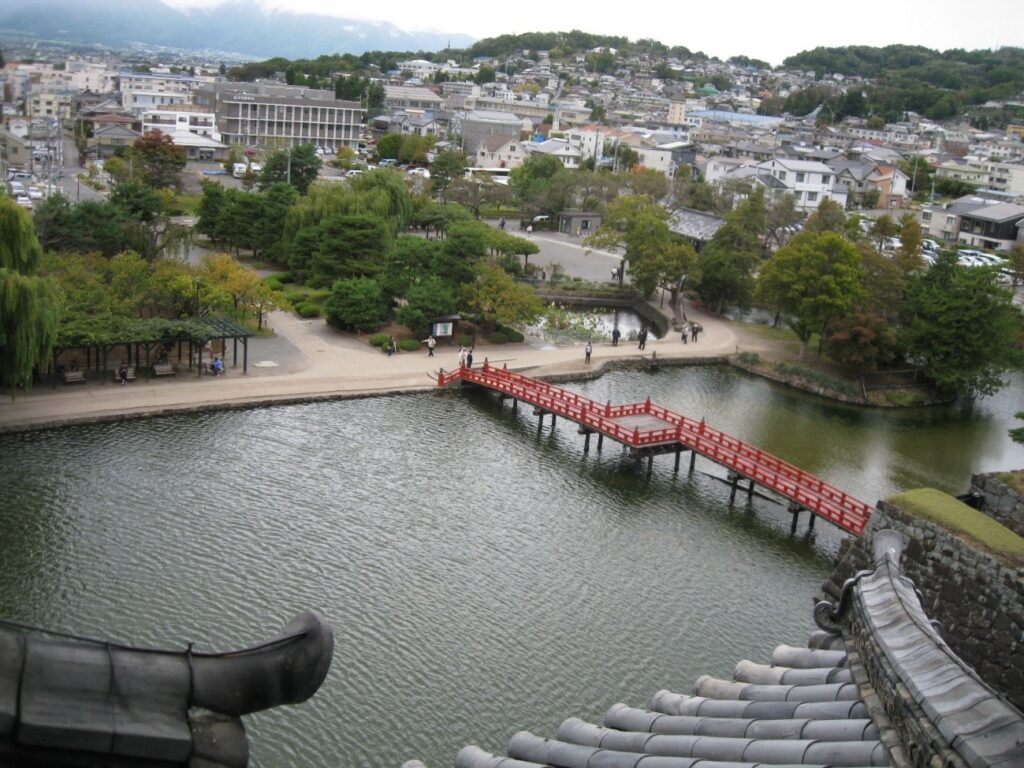 昼頃には霧雨になり、松本城の五重天守の悠々たる風格が美しい。天守に初めて登る者がほとんど。階段の高さや勾配に緊張して登る。柱や棟木の太さ、梁の抜き造りに驚く。大阪万博木造アーチもすごいが、400年前の建築の匠の技に驚きを隠せない。展示されている武具用品などは昔を偲ばせる。一時の歴史に浸りゆっくり歩む。
