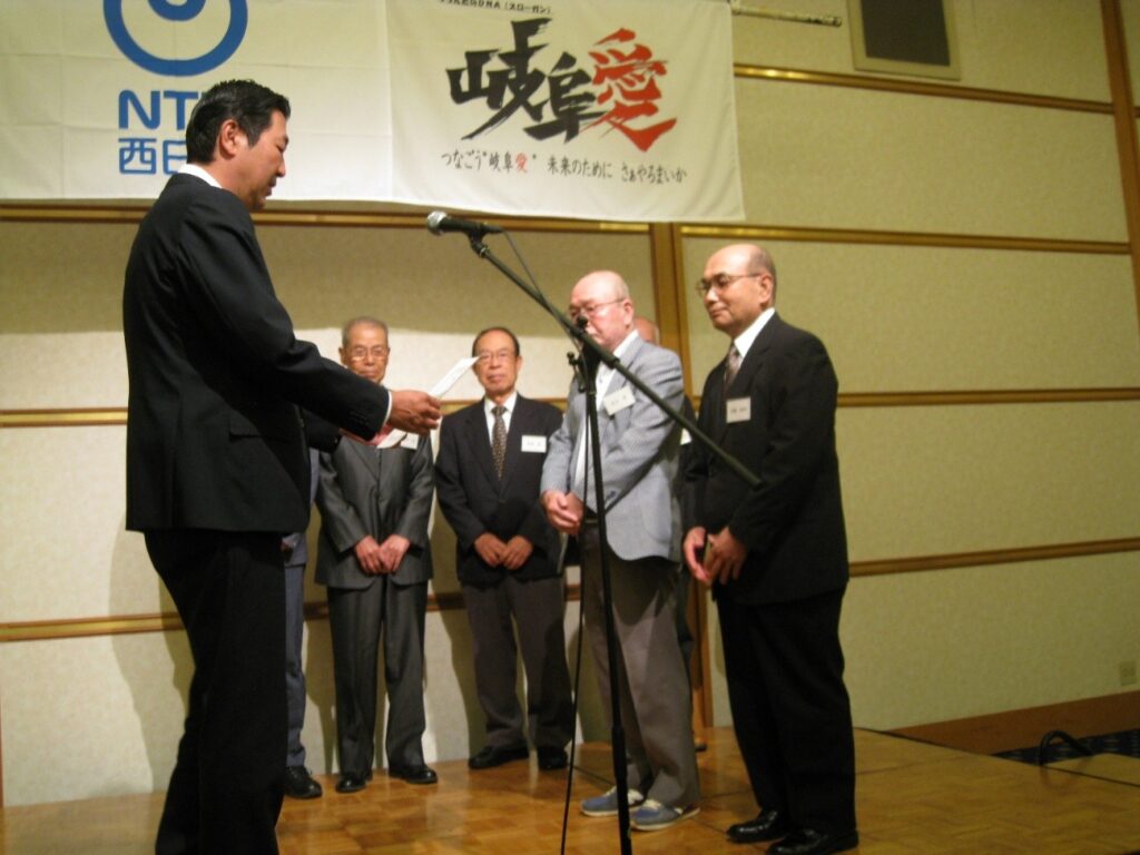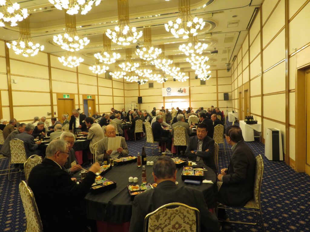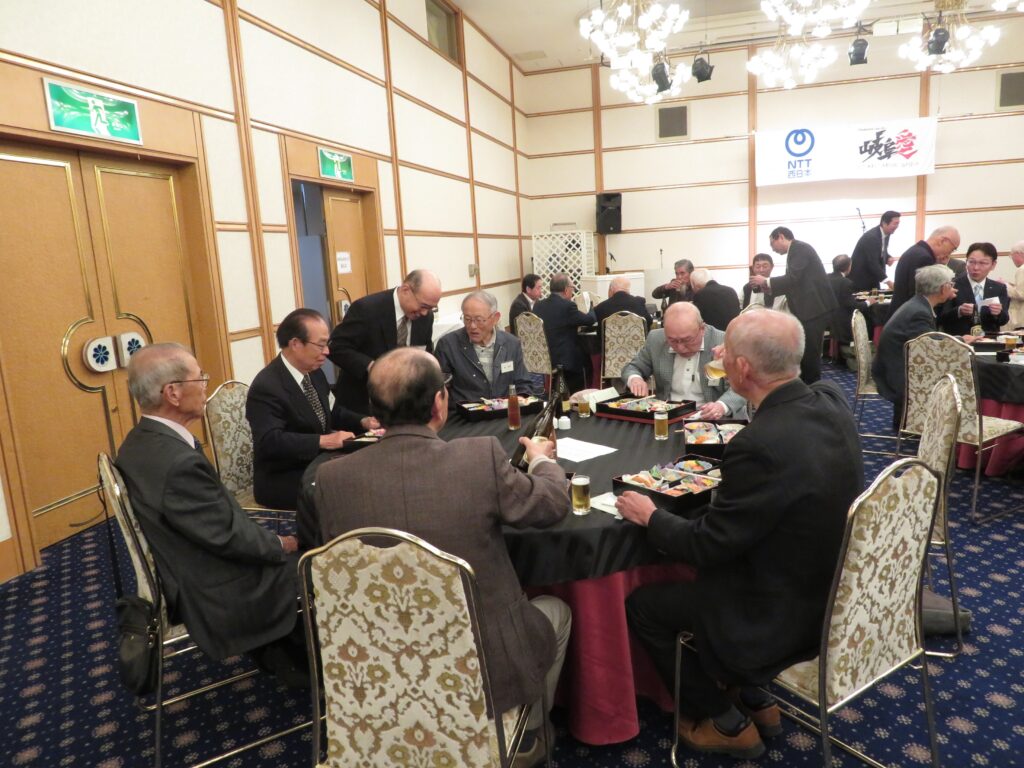 続いてNTT岐阜支店長から日頃の「社会貢献活動賞」として多治見市内の不法投棄巡回集収等の美化活動サークル「NTT-OG・OBやまびこ会(代表市橋紀一)」への表彰が行われました。 地味な活動ながら永年の活動が認められ、さらなる継続実施への励みになるとメンバーから喜ばれました。その後、旧友会東濃代表幹事丹羽大三氏によりNTTの発展と旧友会の連帯活動の誓いを込めて乾杯し、昼の宴に入り円卓形式和食料理と飲み物で食事を楽しみで話が弾む。高度成長期に働いた旧友会の皆さんは元気で話が尽きず賑やかでした。締めでは、NTT労組退職者の新会長井上哲男氏挨拶、高齢化で会員の減少傾向にありますが、コンパクト活動でも元気に継続すること、現役NTTの皆さん、退職旧友会員の健康と活躍を祈り一本絞めで終了しました。(東濃地区通信員 丹羽 啓 記)