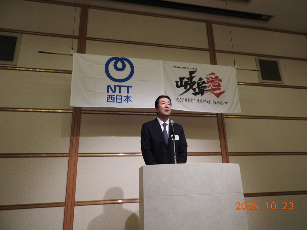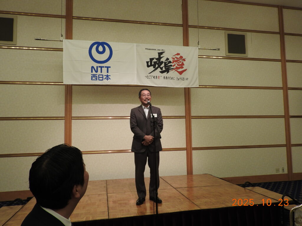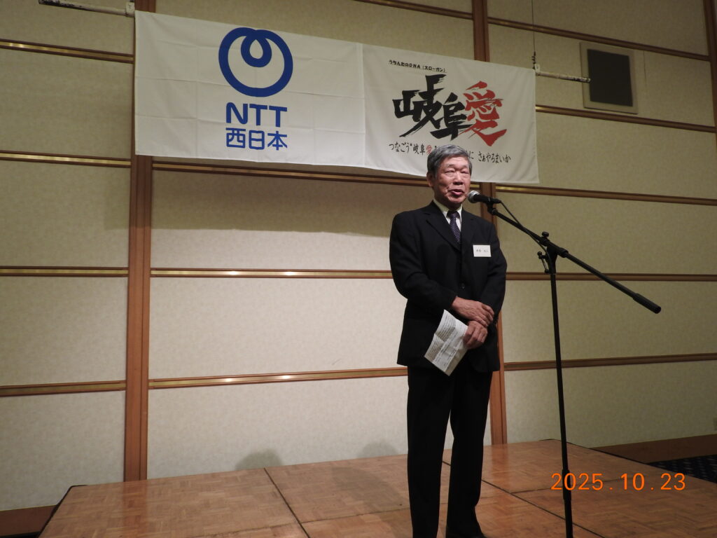 恒例のNTT退職者交流会は、電信電話記念日の意義深い日の開催となりました。最初にNTT西日本(㈱)岐阜支店長立木祥平様から、日頃のNTT事業への協力のお礼があり最近の動きについてお話しを頂いた。①NTT西日本の2025年度経営状況は、厳しい状況ですが前年比より増収の見込み。②民営化から40年の節目、称号とCIを変更。西日本電信電話株式会社からNTT西日本株式会社へ、グローバル市場で競争力を強化、ブランド価値向上を目指す。③効率的な営業体制構築のめざし、岐阜管内の東濃拠点、大垣拠点を化実施。④メタル設備の加入電話を光・モバイルを用いたサービスへ順次移行の方向。⑤地域課題解決へのチャレンジとして、下呂市から多治見市6市と共同事業体を組成し、自動運転バスの実証実験を推進する。など、この秋から順次実施予定(全国初の取り組み)等の最近の動向の紹介がありました。