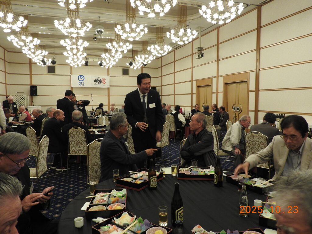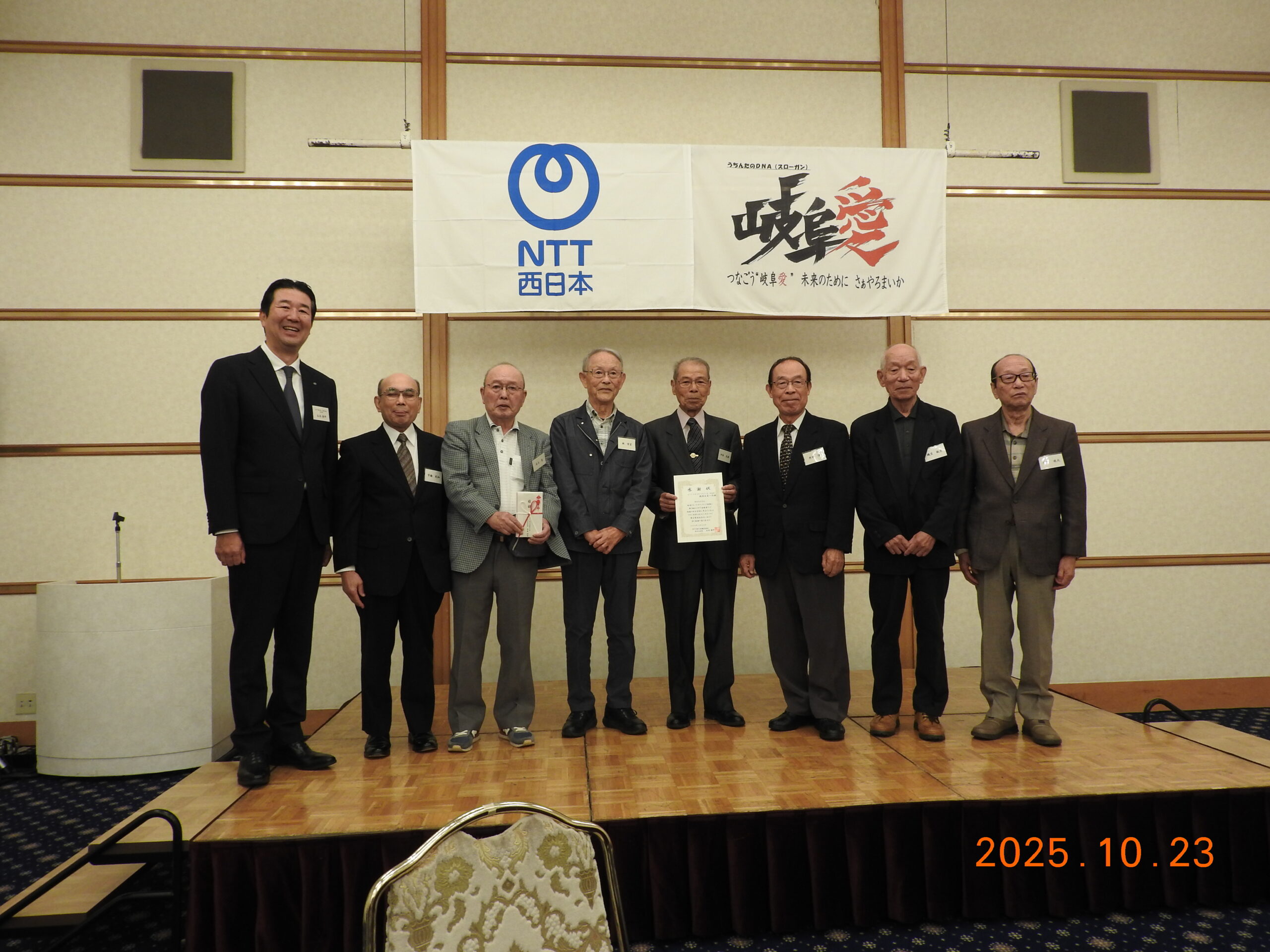 令和7年10月23日、シティホテル美濃加茂において、恒例のNTT退職者交流会が開催され、NTT退職者73名(中濃地区49名、東濃地区19名、岐阜地区2名、飛騨地区3名)が参加しました。NTT退職者交流会は、今年も電信電話記念日と重なり思い出になる開催となりました。最初にNTT西日本立木岐阜支店長より挨拶があり、NTT事業への協力のお礼とNTTグループの事業動向について、①NTT西日本グループの業績2024年度『減収・増益』、2025年度『対前年増益目標』、②NTTの社名・ロゴの変更、③近年の社員減少や効率的な営業体制への見直しによる拠点の集約、④メタル設備を利用した固定電話の光・モバイルを用いたサービスへの移行、⑤地域の課題解決へのチャレンジ事例として東濃地区5市と下呂市で実施されている自動運転バスの実証実験へコンソーシアムにより参画しています。等の報告がありました。続いてNTT西日本岐阜支店の幹部紹介がありました。開会に先立ち、ボランティアサークル「NTT―OB・OGやまびこ会」(多治見)の活動が評価され2025年度社会貢献活動団体としてNTT西日本岐阜支店長表彰を受賞しました。旧友会東濃地区の丹羽大三代表幹事より、旧友会の会員減少が悩みであり、幹部の皆さんからも退職される皆さんに是非入会するようお声掛けのお願い等の挨拶と乾杯の音頭により懇親会に移りました。今回も開催は中濃地区・東濃地区合同での開催となり、参加者も多く、退職後逢う機会がない人との交流ができ、昔話に花を咲かせたり、お互いの健康を確かめ合ったり、お互いの趣味に花を咲かせたり、楽しい時間を過ごしました。名残がつかないうちにお開きの時間となり、退職者の会支部協議会の井上哲男会長の閉会の言葉で終了しました。(中濃地区通信員 續木 保征 記)
