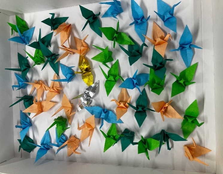 この日は10月中旬にして夏日の気温でしたが、会員19名(在宅作業1名)が福祉会館に集まり、使用済み切手の整理作業に取り組みました。いつもの切手整理作業だけでなく、千羽鶴作りに勤しみましたので紹介させていただきます。本会の会員である加藤寛子さんが所属するウィーン岐阜合唱団が、12月に長崎県で平和を祈念し開催される、「第九合唱祭」に参加するにあたり、折り紙の千羽鶴を持参するため孤軍奮闘されていることを知り、むすびの会も協力することになりました。本会会員で折り紙の講師の経験がある川出智恵子さんの指導のもとで開始しましたが、皆、何十年振りの千羽鶴作りであること、色紙の大きさが約7㎝と小さいことで悪戦苦闘しました。脳トレ!脳トレ!と皆で励まし合い、戦争が無い平和な世界が訪れることを祈願して、目標の50羽の千羽鶴を折りあげてこの日の作業を終わりました。(渡邉 昌司 記)