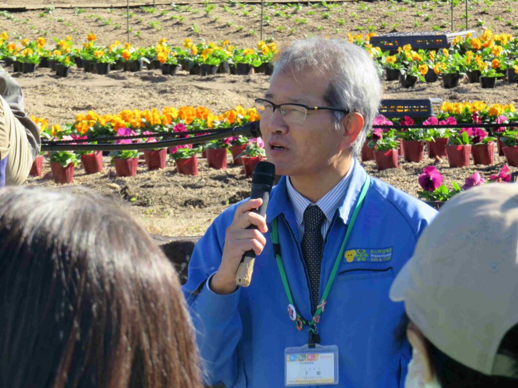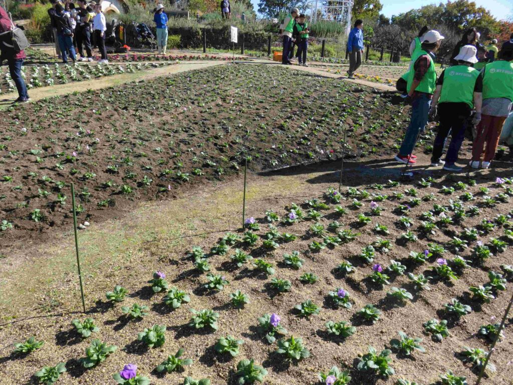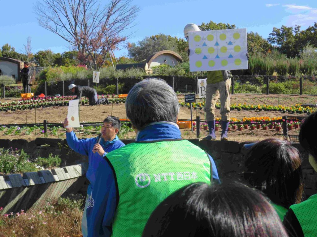 植物園職員からの植え付け作業の説明等を聞 展望台「お花畑」3エリアの内の担当するCエ