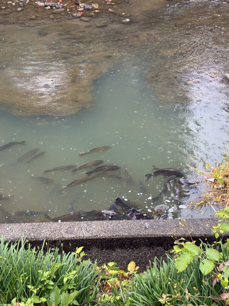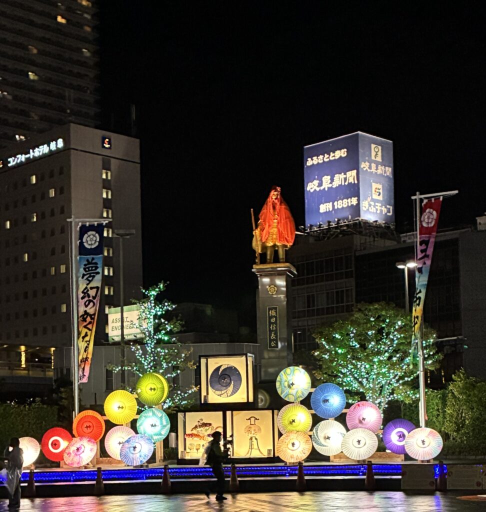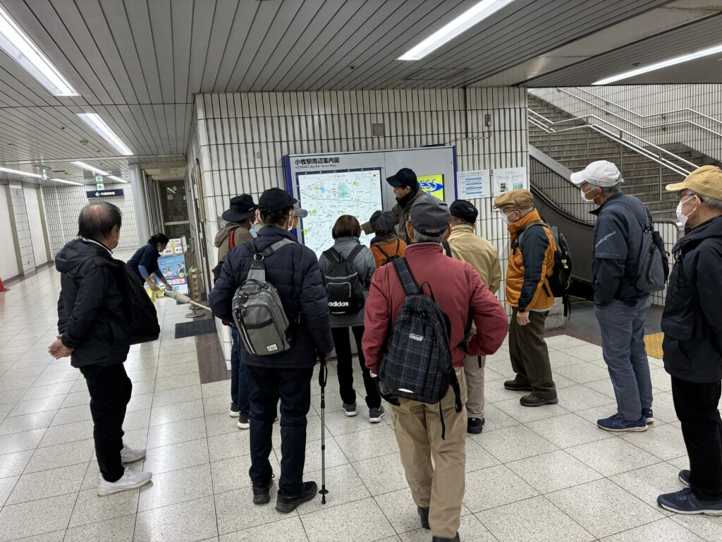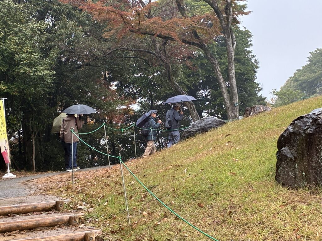 信長公から、かって自らが築き移り住んだ小牧山城の探索を命ぜられ、岐阜駅前に11人の老兵が集りました。名鉄各務原線に乗車、途中の関所で2人の兵士が乗り込み総勢13名の少数精鋭、電車内では周りを警戒しながら静かに進むべきところが、それぞれの近況や残してきた仲間兵士の話で、ワイワイガヤガヤでした。名鉄小牧駅では、小牧山城探索の手筈の説明を受け、降り始めた小雨の中、陣笠をかぶり傘を片手へ兵を進めました。城を取り巻く堀の多くの大きな鯉や数匹の鳥(鷺?)に迎えられ、麓の「れきしるこまき(小牧山城史跡情報館)」に到着、約半里(2㎞)の行程を濡れた路面で滑らないよう気にしながらのゆっくり行進でした。「れきしるこまき」には、小牧山を取り巻く信長、秀吉、家康時代に歴史が模型や映像で紹介されており、少し当時に思いを馳せました。