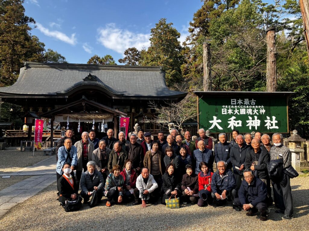 今年のバス旅行も退職者の会と連携して奈良県の大和エリアへ行ってきました。参加者40名は、朝、大垣駅からバスに乗り、三重県を経由して名阪国道の有名な414mもある高低差の道路と大きく回るカーブの連続に驚きながら天理市に入りました。最初に戦艦大和の守護神であった大和神社を参拝しましたが、鳥居から社殿までの参道籠もっていますの長さは、戦艦大和と同じ270mと聞き、はるか遠くに見える鳥居の距離を見て、改めて戦艦が巨大であったと実感しました。昼食は当地の名物である柿の葉寿司を堪能して、午後は初代天皇である神武天皇とその皇后を祀る格式高い橿原神社と神武天皇の陵墓である畝傍山東北陵を参拝して帰途につきました。この日の夜は名古屋や岐阜で初雪が降った日でしたが、大和地域は曇り時々晴で帰途につくまで傘が要らない天気でした。帰りのバスでは、午前中に飲み干して緊急補充したお酒を更に堪能しながらカラオケを歌い大垣へ無事に戻りました。全員整列の写真、参拝の気持ちが込もっています。(渡邉 昌司 記)(追伸 総理大臣宅への挨拶はできませんでした。)