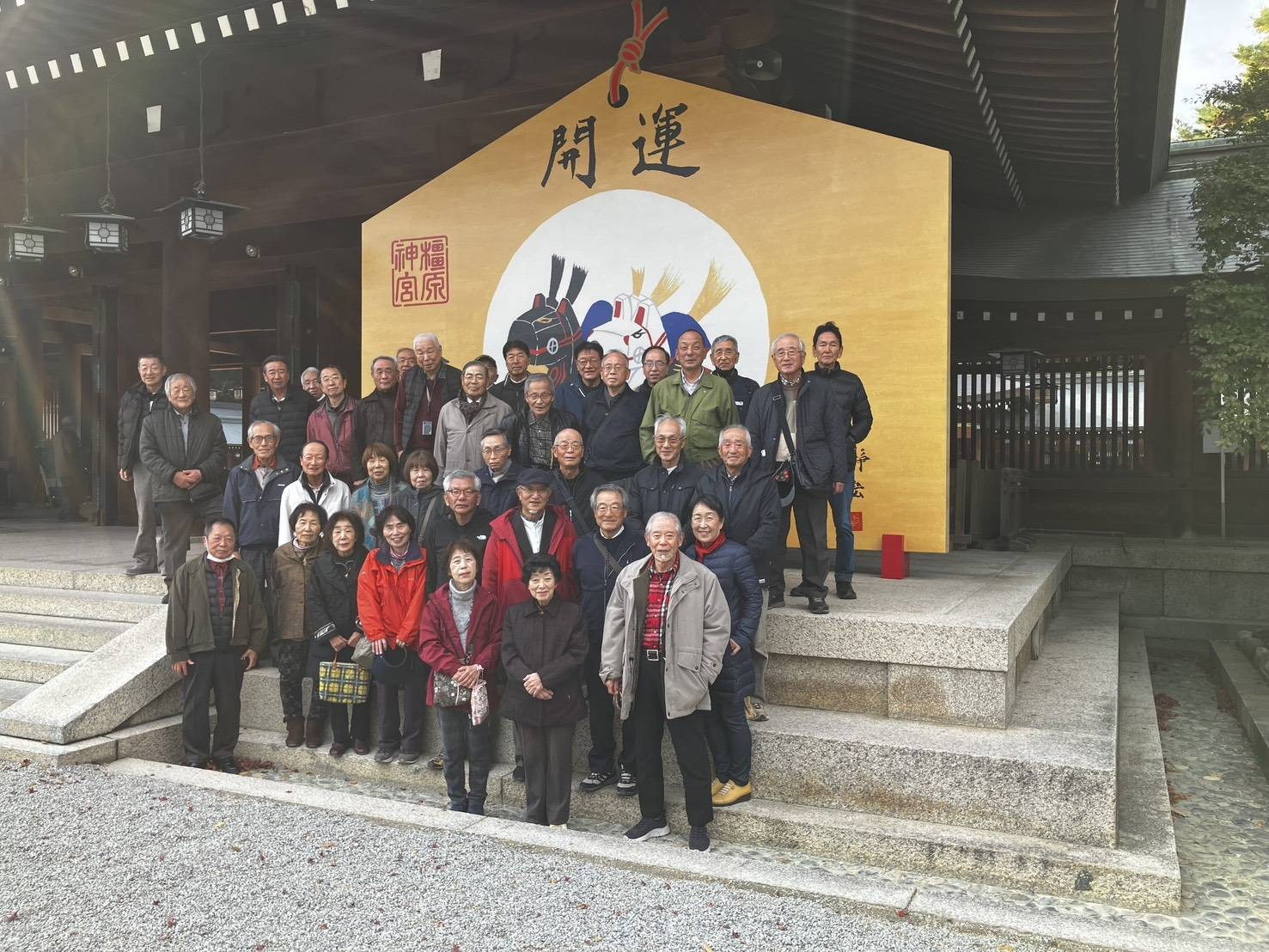今年のバス旅行も退職者の会と連携して奈良県の大和エリアへ行ってきました。参加者40名は、朝、大垣駅からバスに乗り、三重県を経由して名阪国道の有名な414mもある高低差の道路と大きく回るカーブの連続に驚きながら天理市に入りました。最初に戦艦大和の守護神であった大和神社を参拝しましたが、鳥居から社殿までの参道籠もっていますの長さは、戦艦大和と同じ270mと聞き、はるか遠くに見える鳥居の距離を見て、改めて戦艦が巨大であったと実感しました。昼食は当地の名物である柿の葉寿司を堪能して、午後は初代天皇である神武天皇とその皇后を祀る格式高い橿原神社と神武天皇の陵墓である畝傍山東北陵を参拝して帰途につきました。この日の夜は名古屋や岐阜で初雪が降った日でしたが、大和地域は曇り時々晴で帰途につくまで傘が要らない天気でした。帰りのバスでは、午前中に飲み干して緊急補充したお酒を更に堪能しながらカラオケを歌い大垣へ無事に戻りました。全員整列の写真、参拝の気持ちが込もっています。(渡邉 昌司 記)(追伸 総理大臣宅への挨拶はできませんでした。)