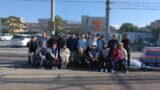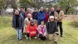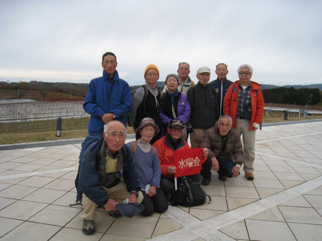 シャトー頂上の鐘を鳴らしたり、ワインの試飲コーナーで夫々好みのワインを飲んだりして、依頼済みの弁当を頂き昼食。いつもの”野菜ジュース?”は、修善寺宿での飲み放題コースとバイキングを予約しており”昼食時は無し”。昼食後は次期水曜会の会長、事務局長改選などの打ち合わせをし、ブドウ畑と晴れてきた富士山をバックに恒例の記念撮影。