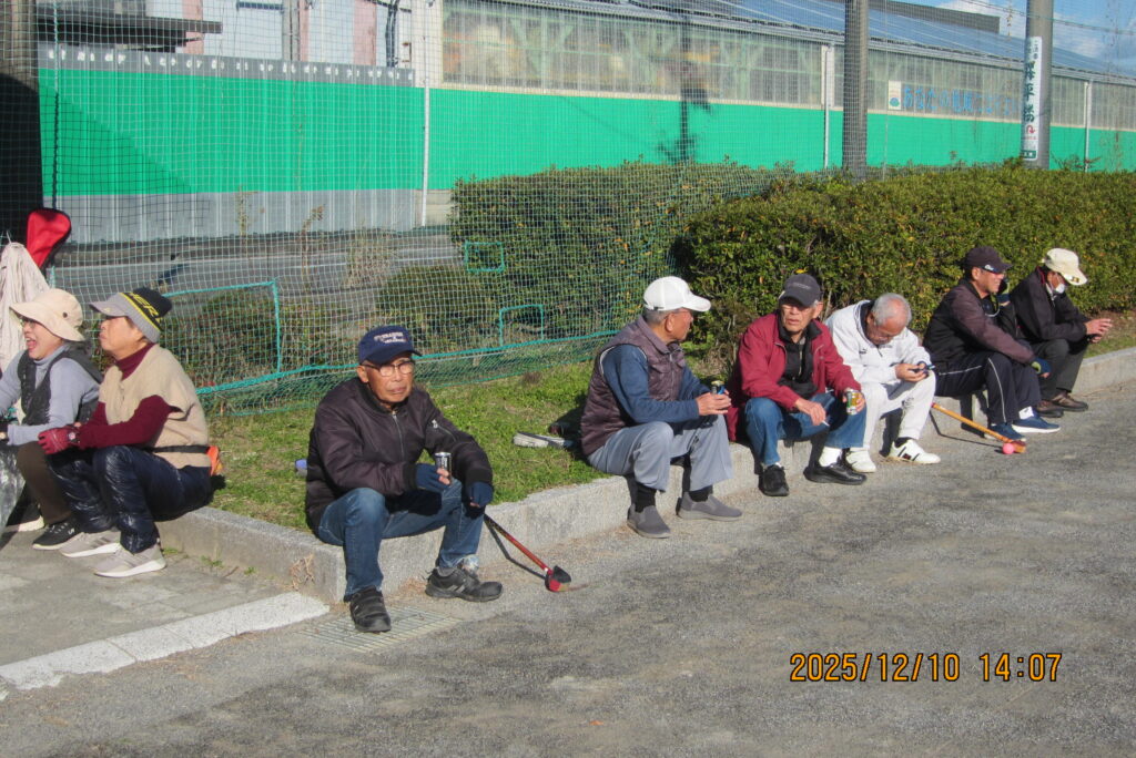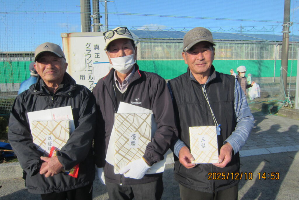 朝晩の冷え込みが厳しい気候ですが、競技の始まる午後からは、暖かいグラウンドゴルフ日和となりました。今回は全くの初心者が参加され他のメンバーさんに迷惑がかかるのではないかと心配していました。クラブを握るのは初めてとのことで、テイショットはスライス、フック、チョロみぎ等多彩でしたが、ロングパットがいくつも入ったり、ホールインワンも達成、ベテラン選手ばかりの大会なのに、BBでもBBメーカーでもなく普通の順位。びっくりでした。同グループのメンバーの温かい指導のおかげだと感謝しています。次回以降の参加をお待ちしております。今回のグラウンドコンディションは、サッカーの練習後のため、少し荒れたグラウンドとなり、低調な大会となりました。今回の優勝者は堀 弘氏(39打・ホールインワン1回)、第2位大岡晴一氏(42打・ホールインワン1回)、第3位村瀬秀志(42打)でした。写真は左から大岡氏・堀氏・村瀬です。次回は来年3月に本巣みどり公園にて開催します、興味のある方は(090-2570-1270)村瀬まで連絡をお願いします。 (村瀬 秀志 記)