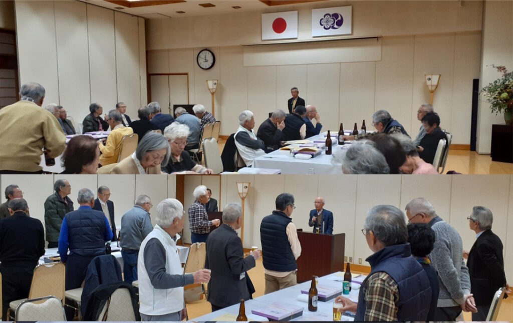 岩田宮司によるご祈祷と会員を代表して水野支部長、大嵜常任幹事、伊藤副常任幹事、蟹江監事、喜寿の森様・山下様、最長寿の小田様・庭瀬様、幹事代表者による玉串奉奠を行い、今年一年の安全・健康長寿を祈願しました。 懇親会は、奥村代表幹事より挨拶をいただき、今年の行事予定の報告がありました。