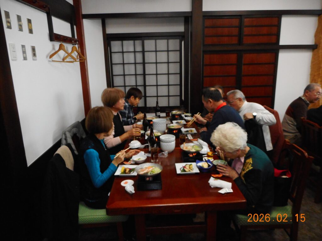 美味しい蟹料理と少しお酒も入って現役時代の話題などで話がはずみました。歓談の途中では、緑区の矢吹様から「矢吹祥雲没後百年展」のご案内や天白区の後藤様から「八事興正寺での吟行会」へのお誘いもあり、これらの話題でさらに会場が盛り上がりました。