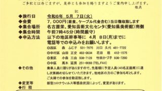「春のバス旅行」案内パンフレット 他地区の方のご参加も、歓迎致します。 皆さま方、多数のご参加をお待致しております。 記 ( 髙木延男 )